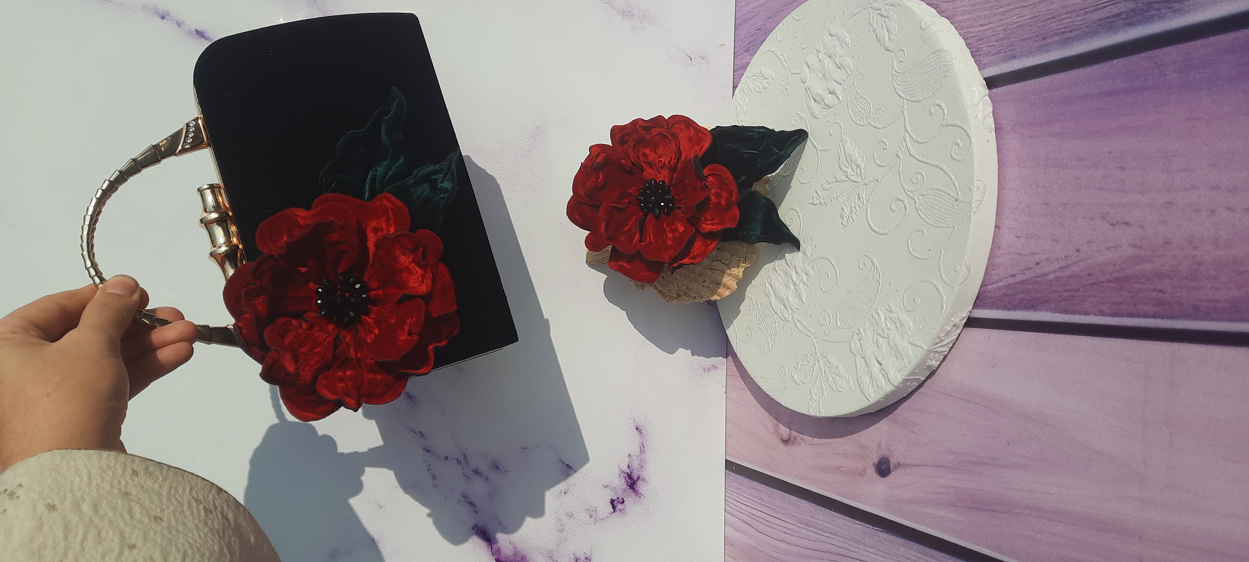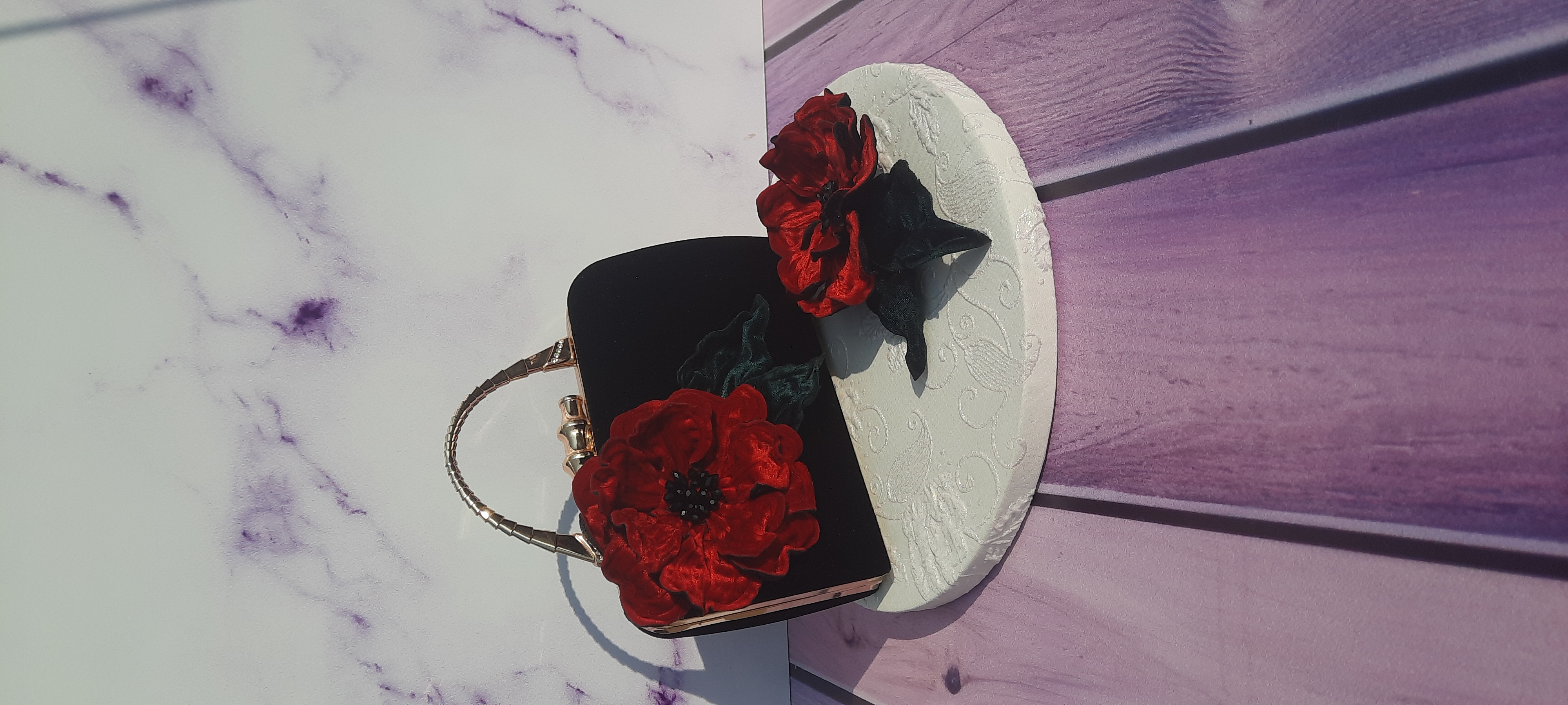 کیف مخمل شاین مشکی با سنجاق‌سینه گل