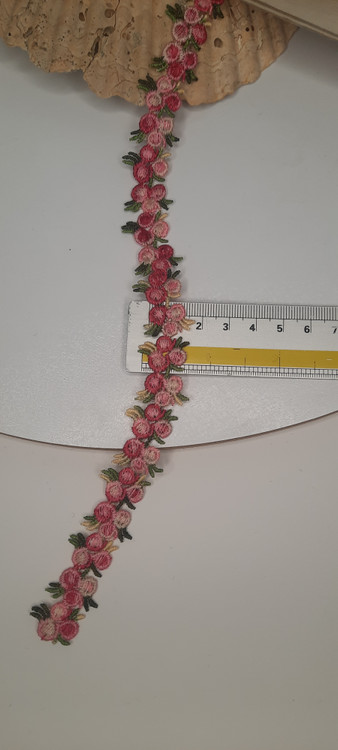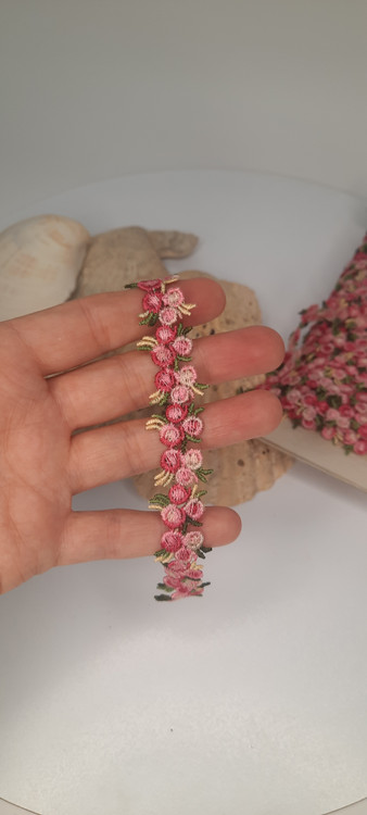 نوار دانتل گل ریز گلدوزیشده با رنگ صورتی، مناسب تزئین و دوخت انواع لباس، مانتو، لباس کودک، اکسسوری و کارهای هنری. طراحی ظریف و گلهای ریز پشتسرهم، جلوهای لطیف و شیک به کار میدهد. محصول با کیفیت مناسب و انعطافپذیری خوب، بهصورت متری عرضه میشود.
